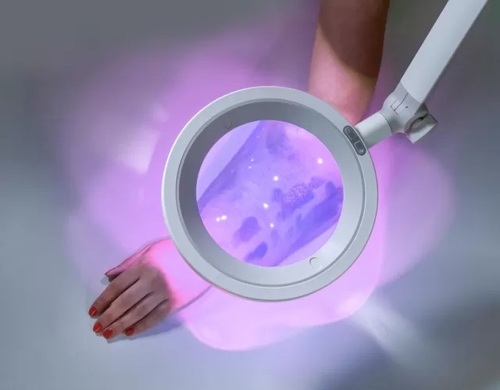 Med 6 000 Lux, Ra > 95 fargegjengivelse og et homogent, dimbart lysfelt får du optimal arbeidsbelysning uansett prosedyre. Valgfritt Wood's-lys (365 nm UV-A) gjør det mulig å påvise fluorescerende sykdomsområder og pigmentforandringer som ikke er synlige i vanlig hvitt lys.